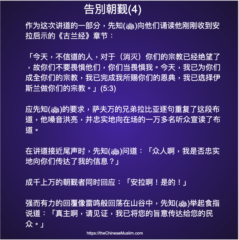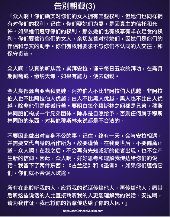 为世人而创设的最古的清真寺,确是在麦加的那所吉祥的天房、全世界的向导。其中有许多明证,如易卜拉欣的立足地;凡入其中的人都得安宁。凡能旅行到天房的,人人都有为真主而朝觐天房的义务。不信道的人,(无损于真主),因为真主确是无求于全世界的。